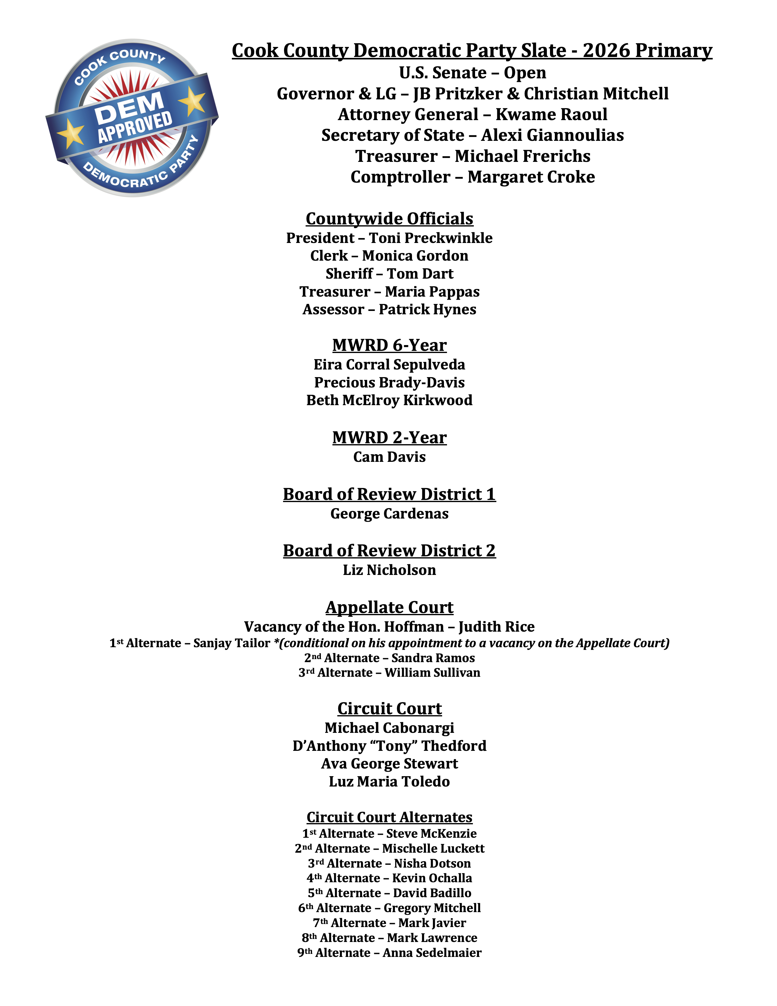 Paid for by the Cook County Democratic Party. A copy of our report filed with the State Board of Elections is (or will be) available on the Board's official website (www.elections.il.gov) or for purchase from the State Board of Elections, Springfield, Illinois.